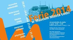 Muzealne poniedziałki, historyczne wtorki, łódzkie środy, muzyczne czwartki i artystyczne piątki – to tytuły zajęć, w jakich dzieci w wieku 6-12 lat będą mogły uczestniczyć w Muzeum Miasta Łodzi w zbliżającym się okresie ferii zimowych (20-24 i 27-31 stycznia 2014 r.). Oprócz interesujących tematów mali goście muzeum będą mieć zagwarantowany pyszny poczęstunek ufundowany przez Cukiernie P. Skórka i ciepłą herbatę, którą zapewni Katering Pałacowy. Zajęcia są bezpłatne, jednak z uwagi na ograniczoną liczbę miejsc obowiązują zapisy pod numerem 42 254 90 11 lub mailem wycieczki@muzeum-lodz.pl.